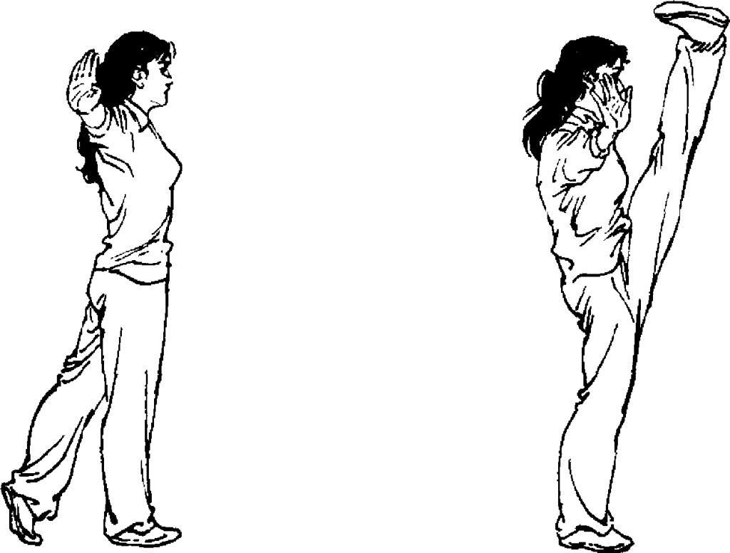两臂平伸,手掌直立,同时左右腿轮流上踢,上踢幅度越高越好,真正的高手往往能踢至头顶附近,上踢时可前行可不前行。