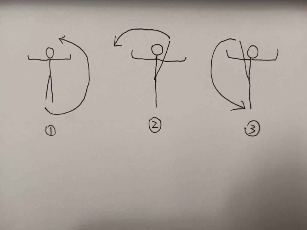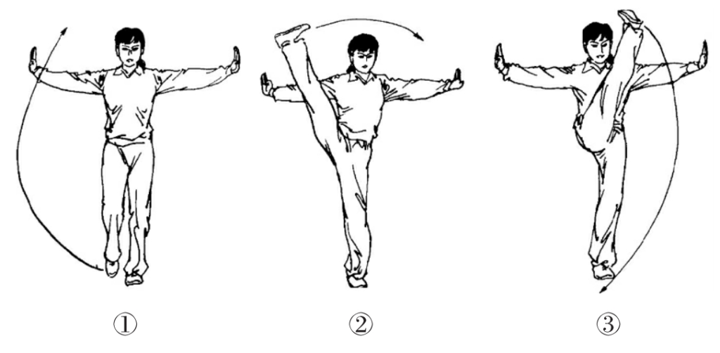 两腿并立,两臂侧平举。一腿伸直支撑,脚尖外摆,另一腿挺直勾脚斜踢,再经面前(或贴头顶)向体侧划弧摆动落下,称为外摆腿。