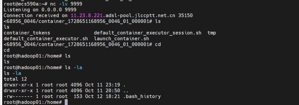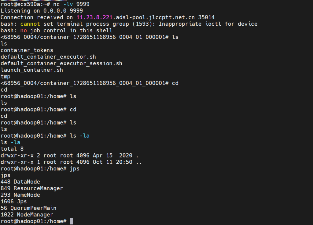 脚本中有两个ip的填写地,第一个是受害机器加8088,第二个是公网机器。然后公网机器可以监听9999也就是脚本里的端口,最后成功拿下docker里的权限目录。